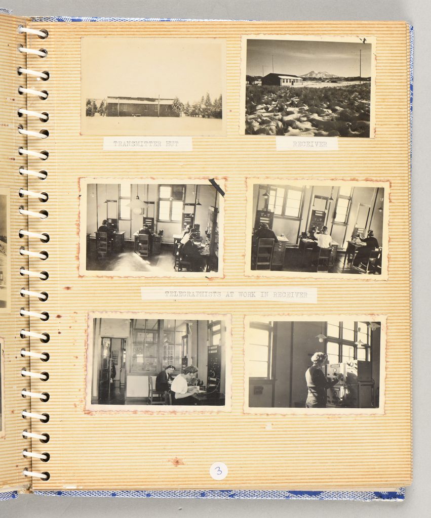 This album contains images of the Wireless Transfer station HMNZS IRIRANGI in Waiouru during the Second World War. Both Fanning and De Courcy served in IRIRANGI, and were later married. Images from the album include the countryside near Waiouru, Ruapehu billowing smoke after an eruption, telegraphists at work, portraits of Wrens (Women’s Royal New Zealand Naval Service) and other sailors, concert parties, sports teams, and gatherings in the snow.