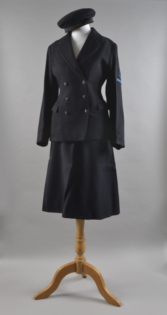 A wedding portrait of Sub Lt Douglas Francis RNZNVR and his bride, L/Wren Patricia Rowe RN taken 26th February 1944 outside Holy Trinity Church, Brompton Rd, London. L/Wren Rowe was employed as a signaller at HMS Vectis, a naval shore establishment at Cowes Castle on the Island of Wight. She met Lt Francis when he was posted to the same establishment. She was married in her WRNS uniform. Her husband donated her uniform to the museum in 1995 and we believe it is the one she was married in, although there is a later addition of a good conduct badge on the left sleeve.