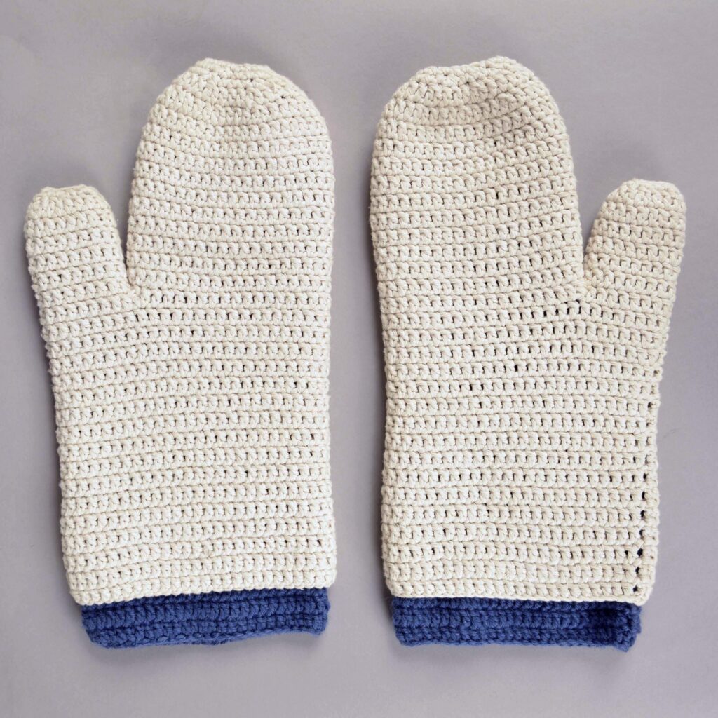 Using the pattern for minesweeper’s gloves provided in the ‘Comforts for Navy’ booklet, we have been able to replicate the style of hard-wearing yet comfortable mittens that would have been sent to the many sailors working on minesweeping vessels during and after the Second World War. They look very close in appearance to SLT Taylor’s gloves above, though his have a knitted lining instead of crochet, and his have cords added to the cuffs to secure the gloves on his hands. We don’t plan on doing any minesweeping with our gloves but reckon they might make good oven mitts!